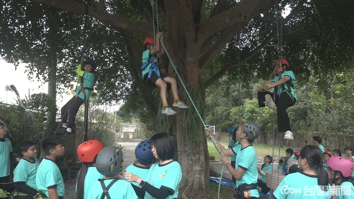 在攀樹體驗中,老師先示範相關技巧和安全注意事項,接著由學生依自己的能力,選擇四種不同高度。對第一次挑戰的低年級孩子來說,趣味又刺激。
