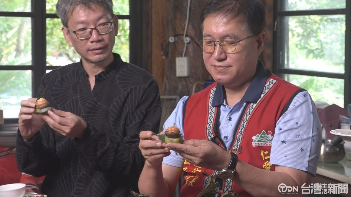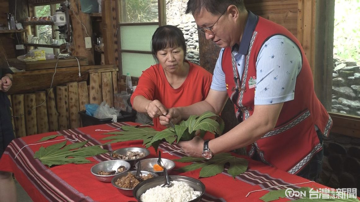 ▲仁愛鄉長江子信(右),體驗製作香糯米飯糰。/記者 王昭聖 攝