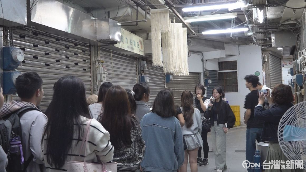 ▲南開科技大學大一國際留學生走進南投市場,老師介紹南投意麵文化/記者 廖韋凌攝