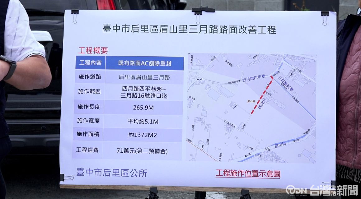 后里區三月路是當地重要的通行道路之一,平時車流量大,且附近農耕機具與重型車輛往返頻繁,長期下來造成路基受損,路面也出現多處龜裂與凹陷,對用路人安全造成威脅,為改善道路品質,當地公所決定動用第二預備金,辦理道路修復工程,預計最快年底前就能完工。