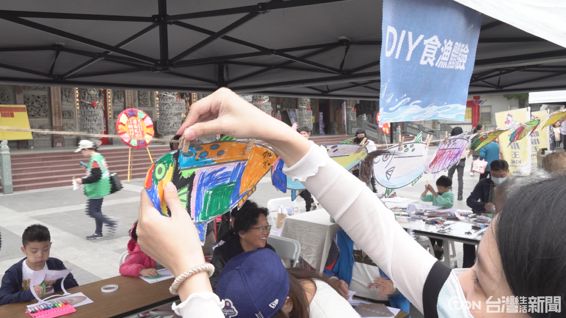 指導老師將小朋友所畫的彩繪掛起來,這是會場所提供食漁教育體驗,包含虱目魚摺紙DIY和創意彩繪,讓小朋友在實際製作中觀察魚體外型,感受漁村文化跟美感創作結合。
