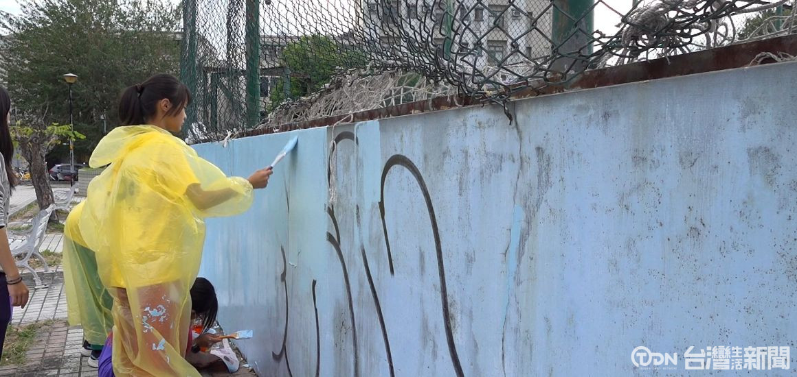 ▲光正國中學生們拿起油漆刷,要將雜亂的塗鴉從牆面抹掉/記者 賴秋峰攝