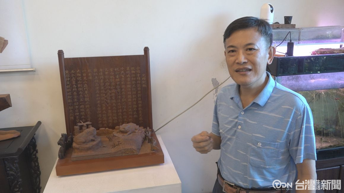 ▲竹山鎮有一位專精用竹子以及茶摳來雕刻的大師--江松智。/記者 周有勝 攝