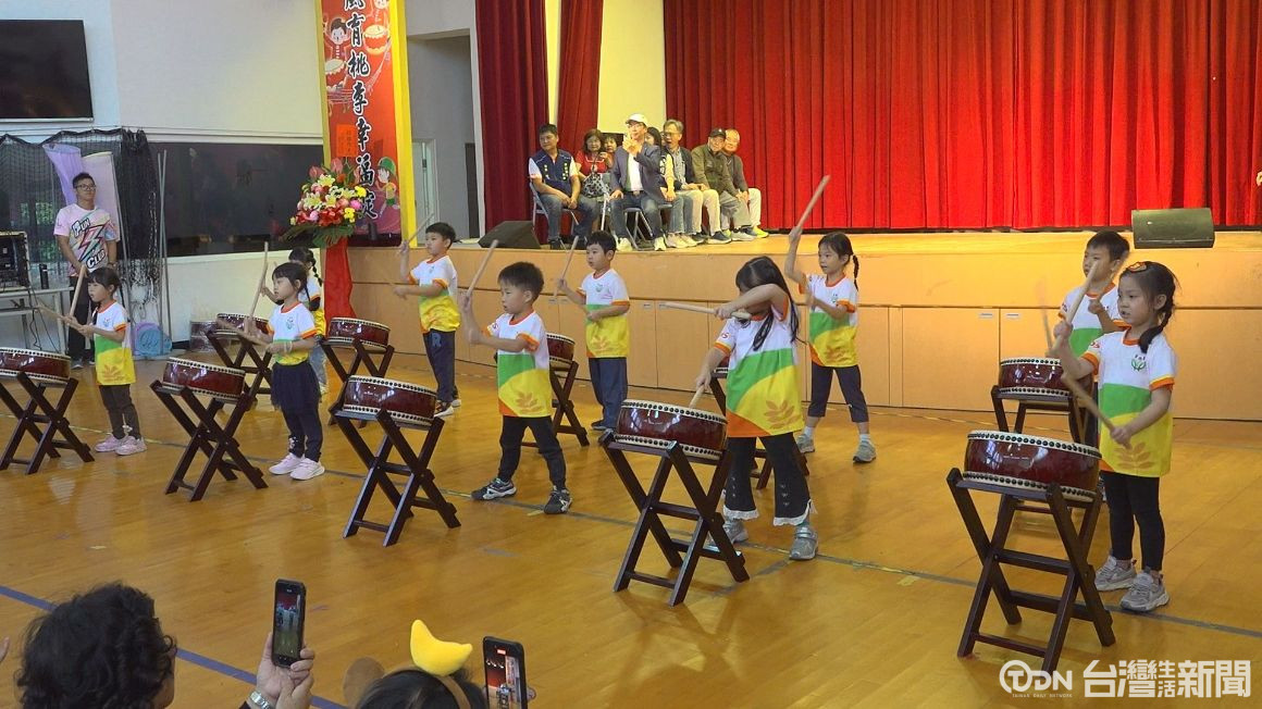 ▲東園國小附設幼稚園的小朋友,帶來可愛又氣勢磅礡的擊鼓表演/記者 陳昭安攝