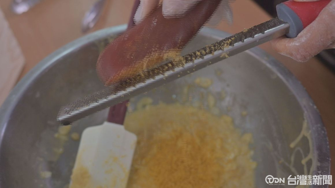 ▲隨著烏魚子產季來到,為了給長者不一樣的烏魚子料理,此次課程就將炙燒烏魚子加入杏仁片當中,讓長者能吃到烏魚子的鹹味跟杏仁的甜味。/記者 陳佳昇 攝。