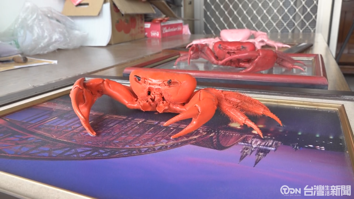 里長回想第一隻漆綠色的螃蟹標本已經將近30年,當時將作品套上臺語的七字調來抒發民主理念,加上陸續的靈感來傳達他製作標本的心境,相當有趣,最近他也贈送一幅給安南區長魏文貴。