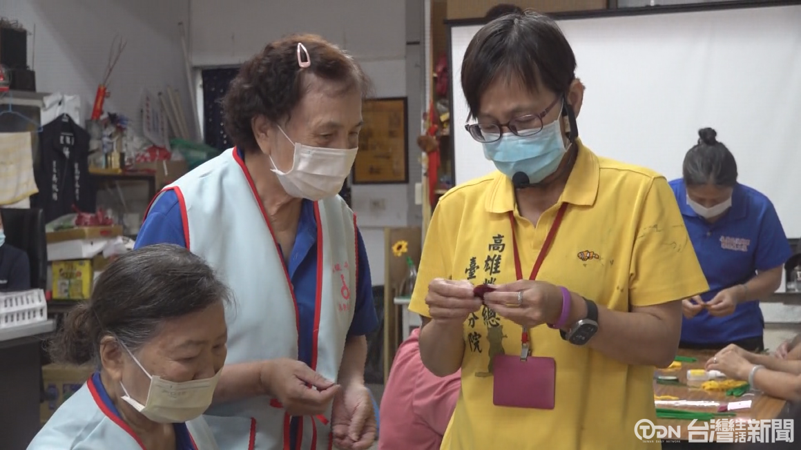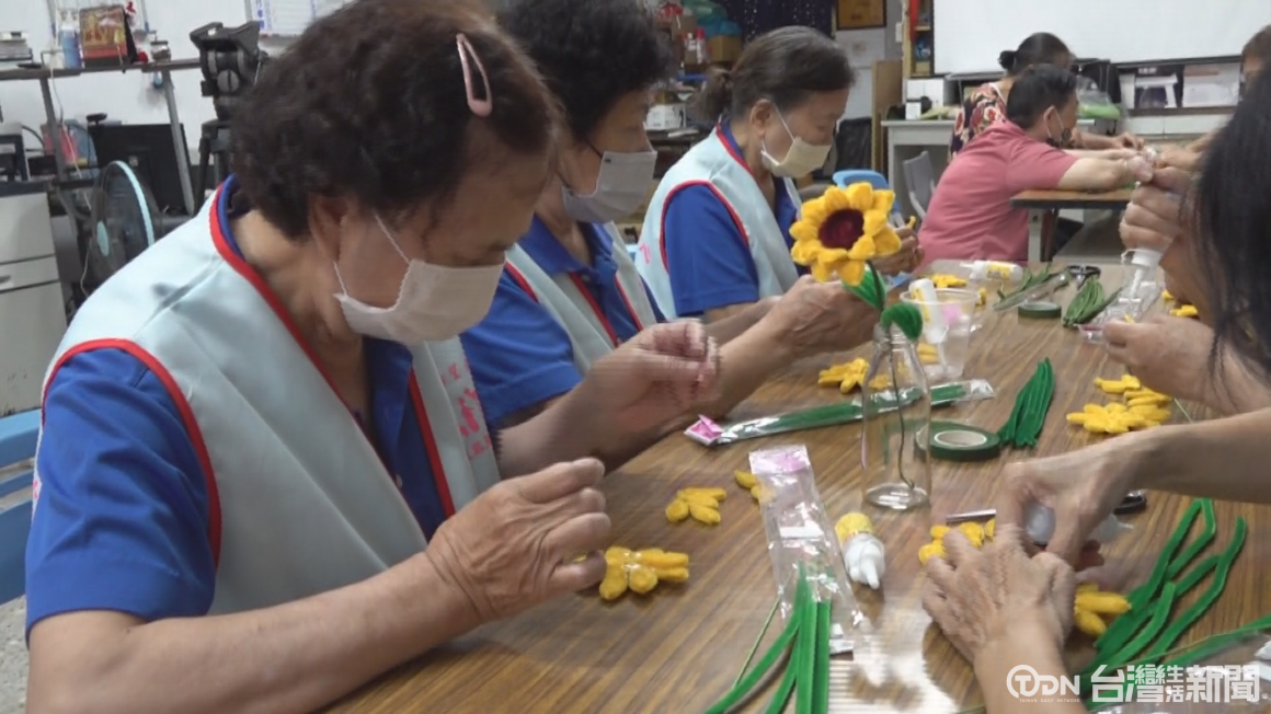 ▲永康復興社區關懷據點帶領阿公阿嬤手作毛根花。/記者 沈孟瑩攝