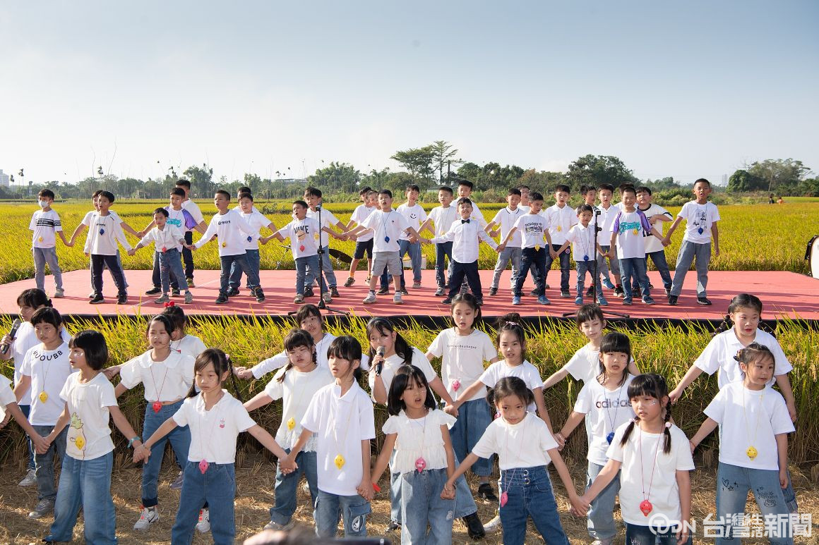 ▲北園國中小和附幼聯合舉辦「稻香藝田音樂祭」,金黃飽滿稻穗化身最美舞台布景。/記者周書聖 攝