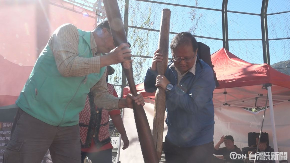 ▲出席長官貴賓,和大家一起體驗舂麻糬。/記者 王昭聖 攝