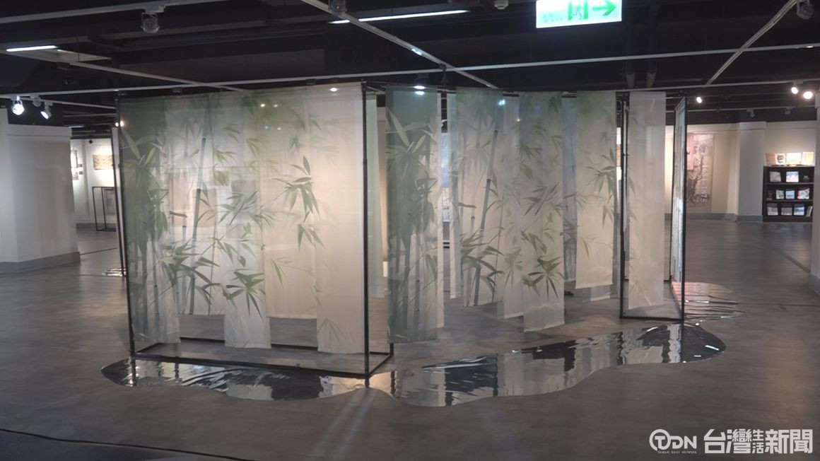 ▲展場中間,以竹子圖樣布簾圍出城牆,地面貼上反光紙,代表護城河,呈現大埔城的意象。/記者 王昭聖 攝
