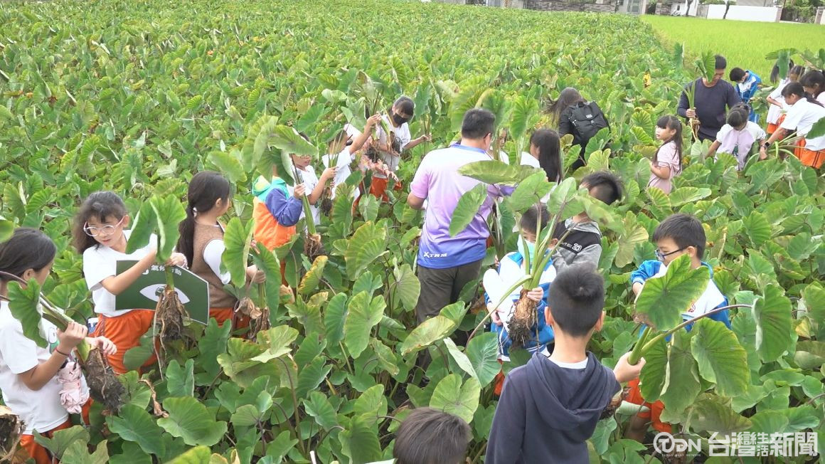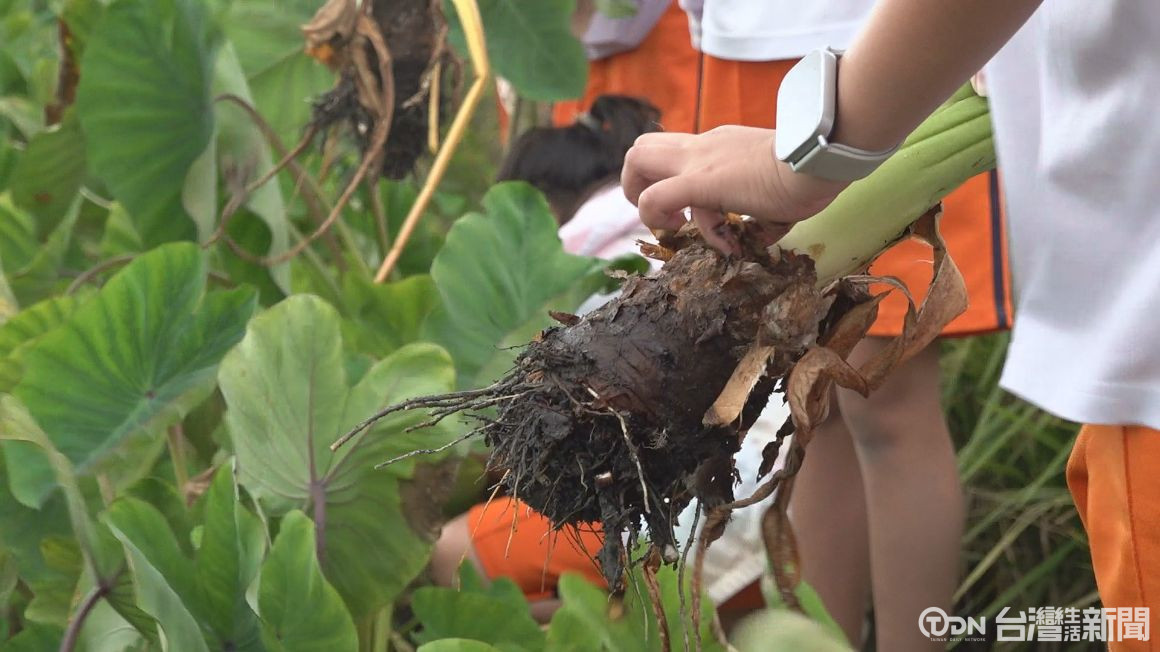 小朋友踩進泥土裡,一手用力拉起芋頭,看到現採的新鮮芋頭,興奮得喊個不停。大甲區農會這天舉辦食農教育,由在地青農帶領大甲國小師生走出教室,親自體驗芋頭的生長與採收。