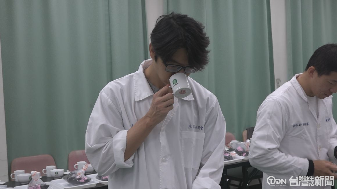 評茶師認真的聞茶香、試滋味,為鹿谷鄉農會冬茶比賽嚴格把關,這33位評茶師,都需要經過嚴格的訓練,除了有許多資深茶農,近年來,也有越來越多年輕人來加入,對鹿谷鄉茶產業的傳承是很有幫助。