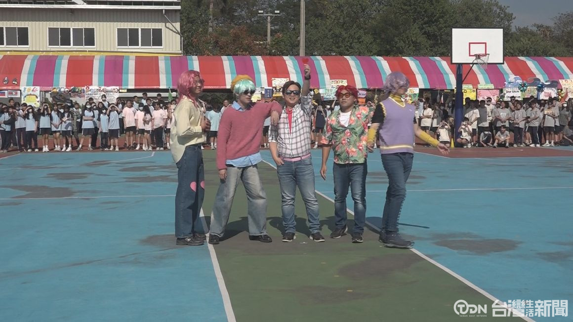 ▲圖為旭光高中校慶運動會熱鬧登場,今年最吸睛的亮點,由校長毛彬權領軍、與四位老師共同組成的限定夢幻男團驚喜登台/記者林妤昕攝