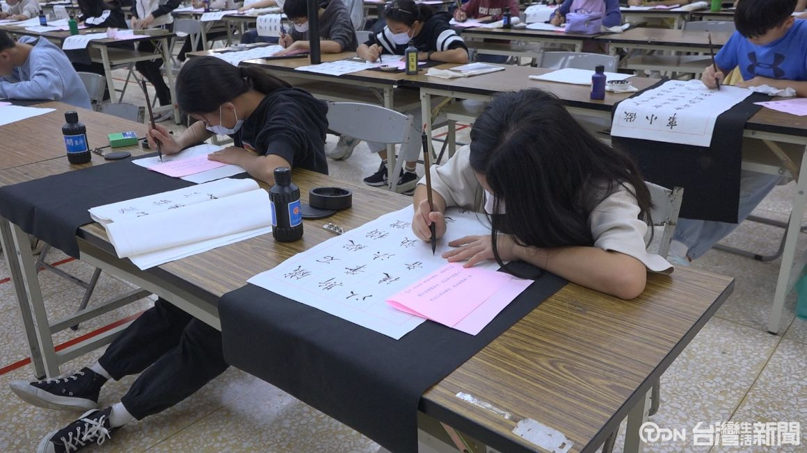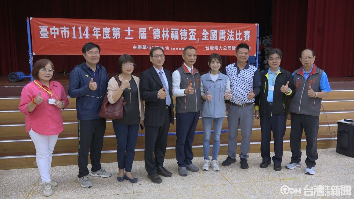 為推廣書法文化,沙鹿區德林宮舉辦第11屆全國書法比賽,這天在沙鹿高工辦理總決賽,由於今年報名踴躍、競爭激烈,因此廟方決定增額錄取,讓賽事更精彩,現場也吸引來自全台的書法好手齊聚,年齡層從國小生到銀髮長輩都有,彼此用書法筆墨一較高下。