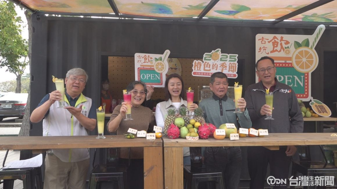 眾人拿起彩色的飲料乾杯,宣布今年古坑柳丁推廣行銷活動「橙色的季節」開幕,鄉公所說明,他們今年是訂各種水果加上柳丁汁做出來的「古坑飲」為主題,民眾在現場消費集點,就能兌換,同時今年他們也特別在會場設置「食農館」,帶民眾深入認識各種品種的柑橘。