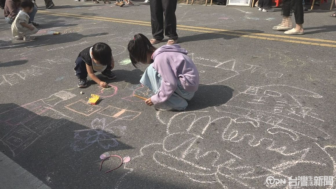 ▲孩子們在馬路上自恣意繪圖,展現想像力。記者 謝沂辰/攝