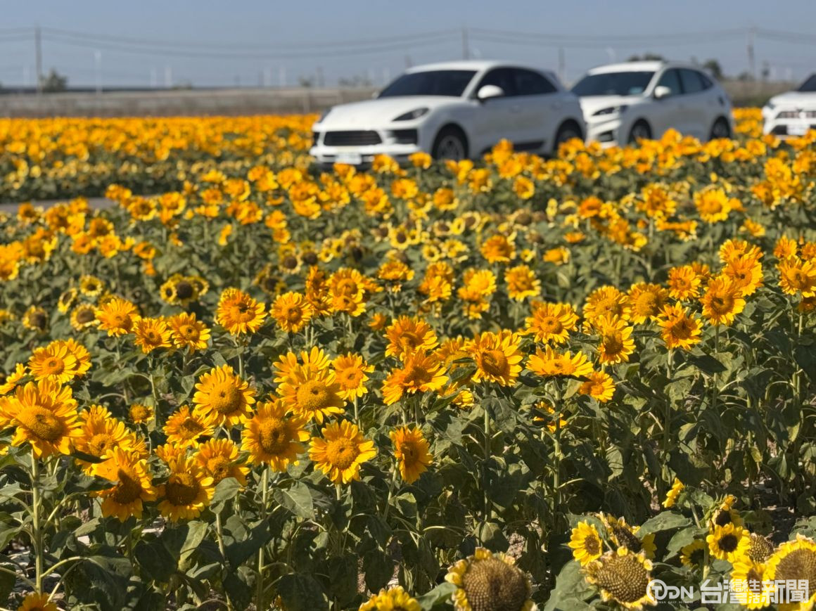 ▲新港田間的太陽花正盛開,吸引不少民眾前來拍照打卡,鄉公所提醒,賞花之餘請愛護花田,用實際行動支持在地農業。/記者黃培怡 攝