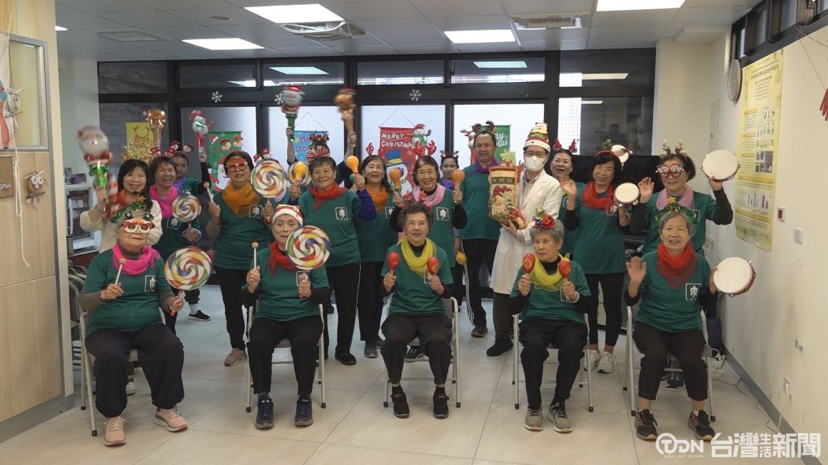 ▲老師帶著長者將練習許久的表演展現出來,也藉著零食分享,感受聖誕節的快樂氣氛。記者林虹伯/攝