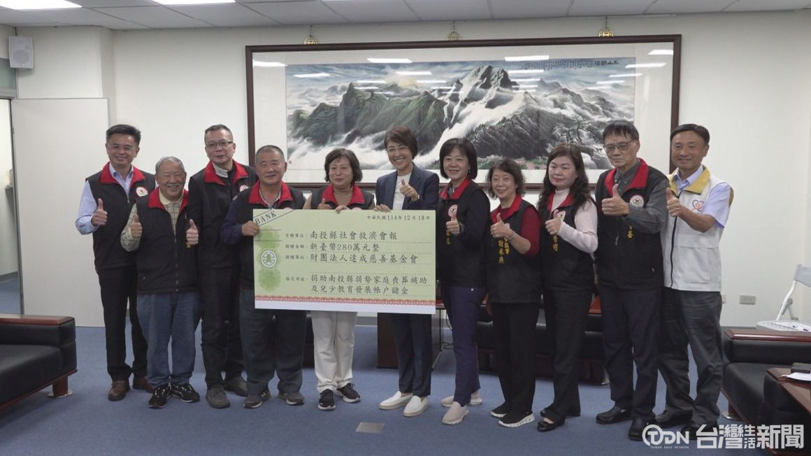 將現金支票捐贈給縣府,由縣長許淑華代表接受,達成慈善基金會今年第二度來到南投縣行善。這次一共捐出兩百八十萬元善款,希望協助無力負擔喪葬費用的弱勢家庭,其中也有三十萬元,將投入「兒童及少年未來教育與發展帳戶」計畫,幫助孩子穩定就學、安心成長。