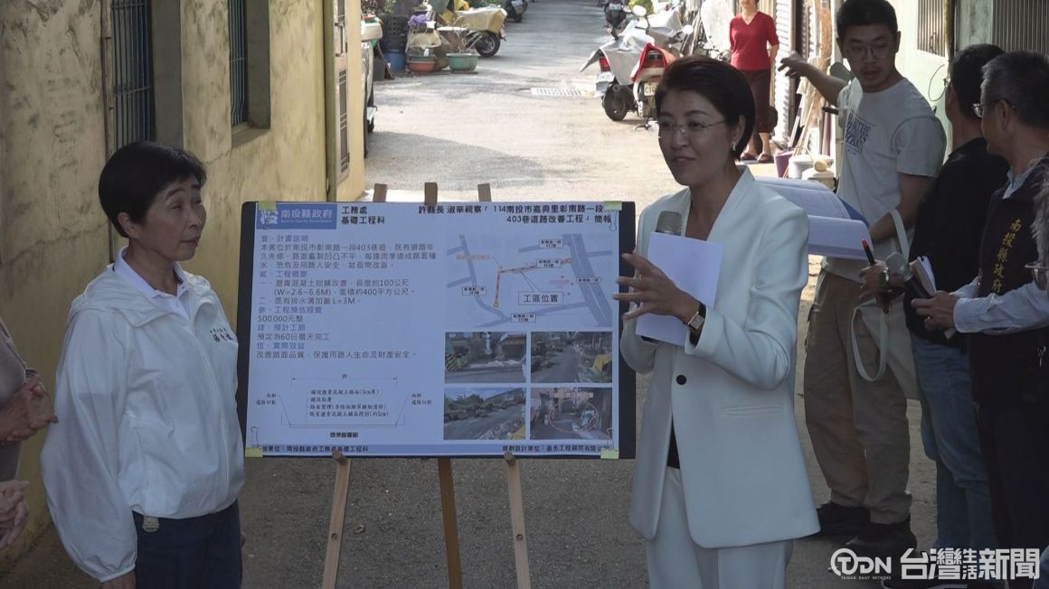 縣長許淑華、市長張嘉哲以及議員張秀枝,一起到場實地會勘,巷道內不少居民也到現場反映使用情形。縣府團隊準備簡報,說明目前路面受損狀況,並提出改善工法與施工期程,希望能在最短時間內完成改善。