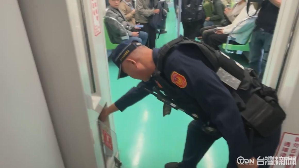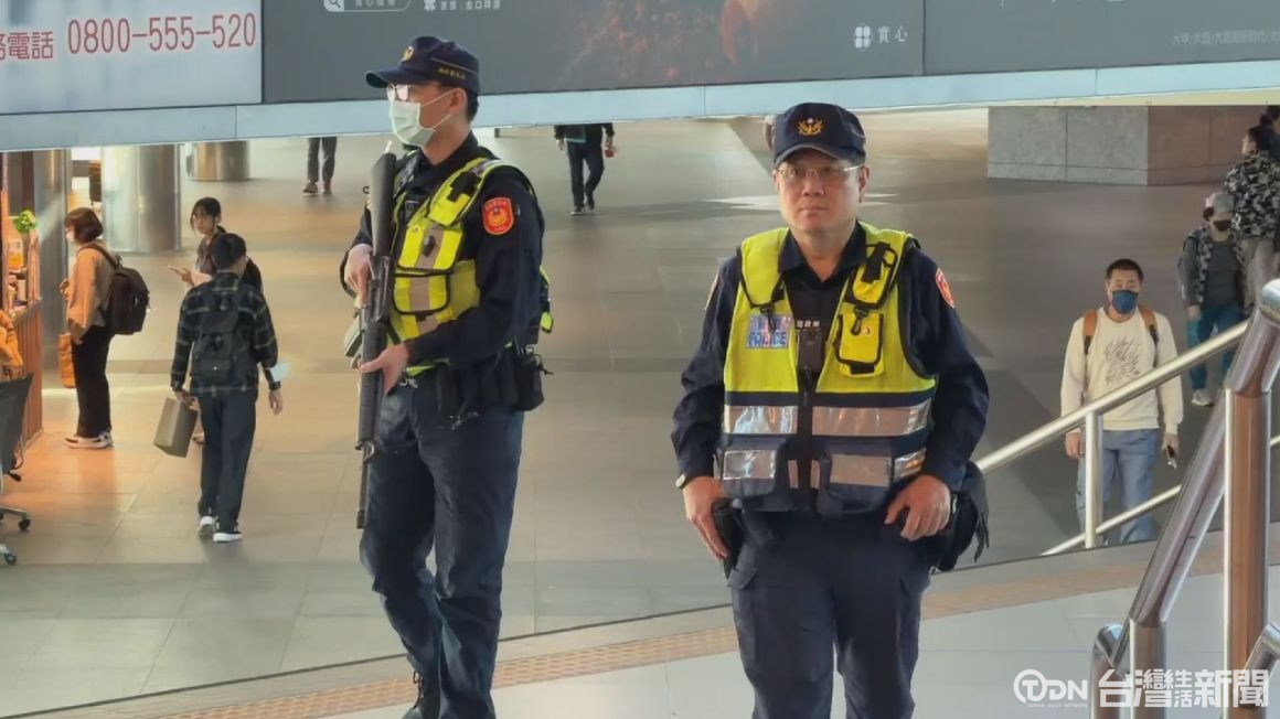 警察全副武裝在捷運高鐵台中站來回巡邏,防堵北捷事件模仿效應,台中市長宣布全城戒備、立即提高見警率。