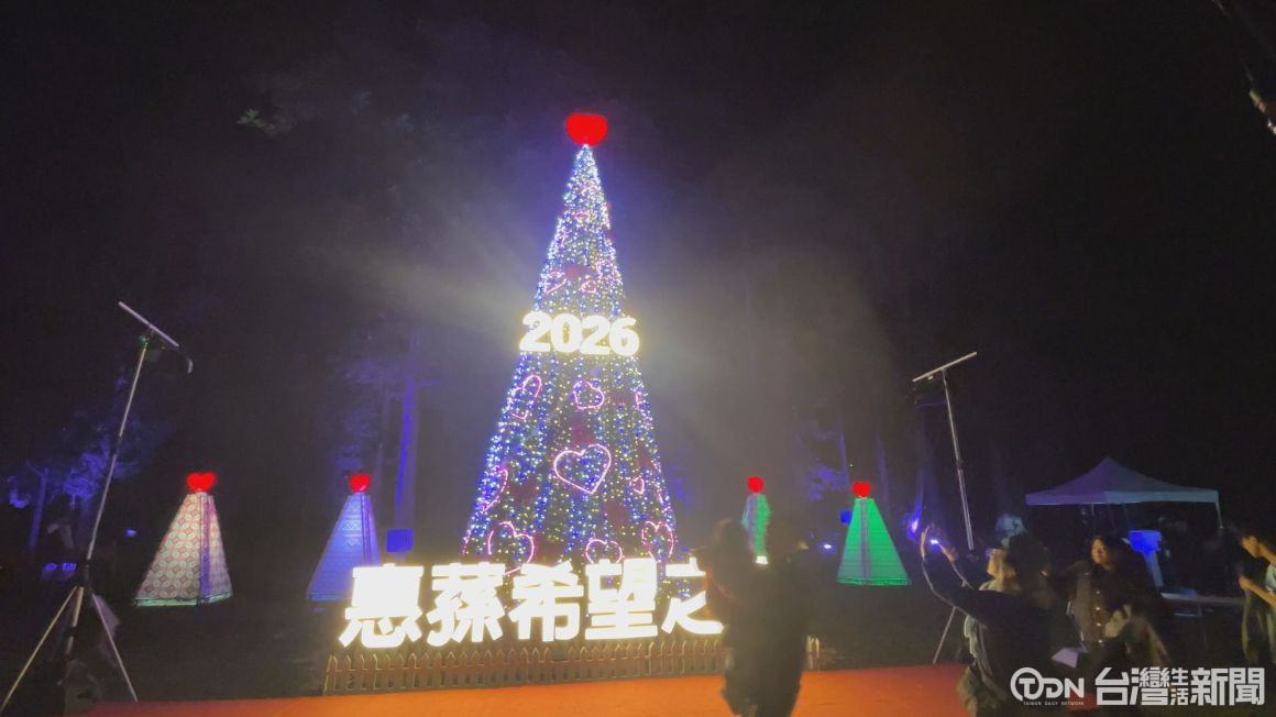 惠蓀林場12公尺的耶誕樹點亮,還飄出人造雪,讓大小朋友超驚喜,頂端璀璨的樹頂心,象徵興大的精神之光,傳遞著祝福、關懷與生命力,中台灣室內最大的耶誕樹也見客,有趣的是聖誕老公公卡在樹中,等待大家的暖心救援。