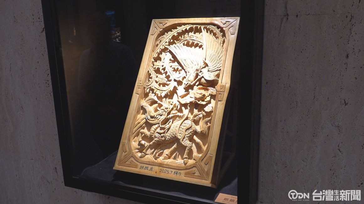▲木雕鑿花技法多元,包括陰雕、陽雕、浮雕、透雕、圓雕、鑲雕等手法,並融合發展出「內枝外葉、鏤空均勻、顧邊、鋪面」等專業口訣和技巧。張旭輝老師的作品兼具文化底蘊與藝術創新,展現雲林在地工藝的精神價值與人文厚度。/記者 陳佳昇 攝。