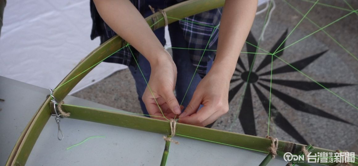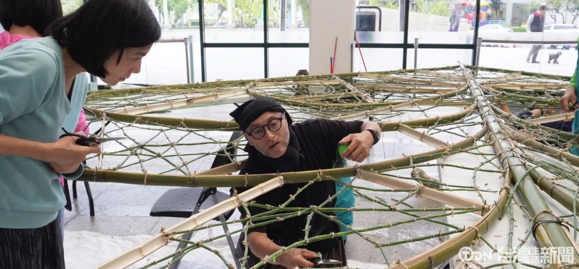 ▲日本花道家上野雄次與志工民眾,一起創作高達10公尺的「線與脈」大型裝置作品/記者 賴秋峰攝