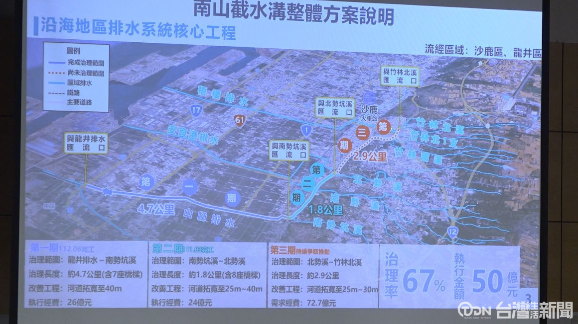 市府水利局表示,南山截水溝第三期整治長度約2.9公里,總經費高達72.7億元,其中用地費31.8億元、工程費40.9億元,規畫分兩階段推動,將以明渠、暗渠及推管等工法,分年完成整體治理,而民代也呼籲中央應儘速核定經費,讓工程早日動工,完善海線防洪最後一哩路。