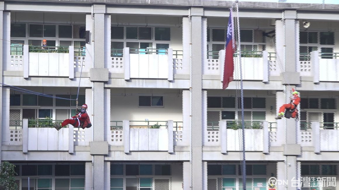 ▲虎行聖誕老公公從三層樓高校舍降落,學童驚喜/記者 林佳樺攝