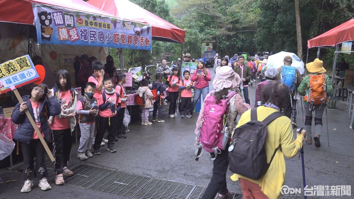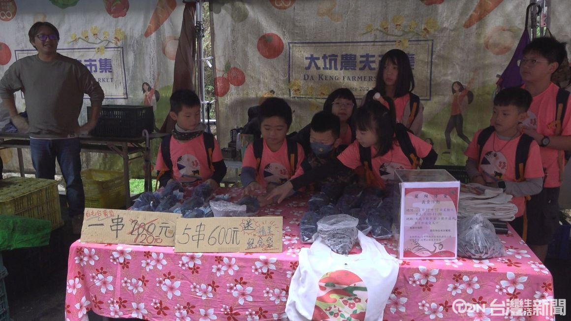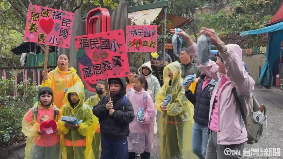 回饋社會支持偏鄉小校教育,新社區福民國小全校總動員將手作300件陶藝花器及120包白毛台葡萄在大坑9號步道口前義賣,雖然碰到壞天氣下雨但大家熱情布減奮力叫賣跳舞宣傳,連攤商們看了都很感動,捧場支持。