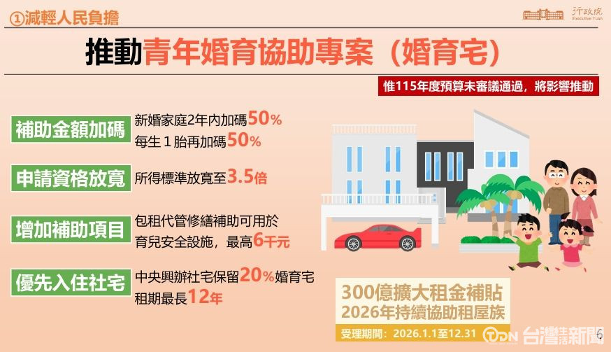 ▲115年1/1新制其中包括中興興辦社宅保留20%婚育宅,租期最長12年,以及擴大租屋補貼。圖/翻攝行政院官網。