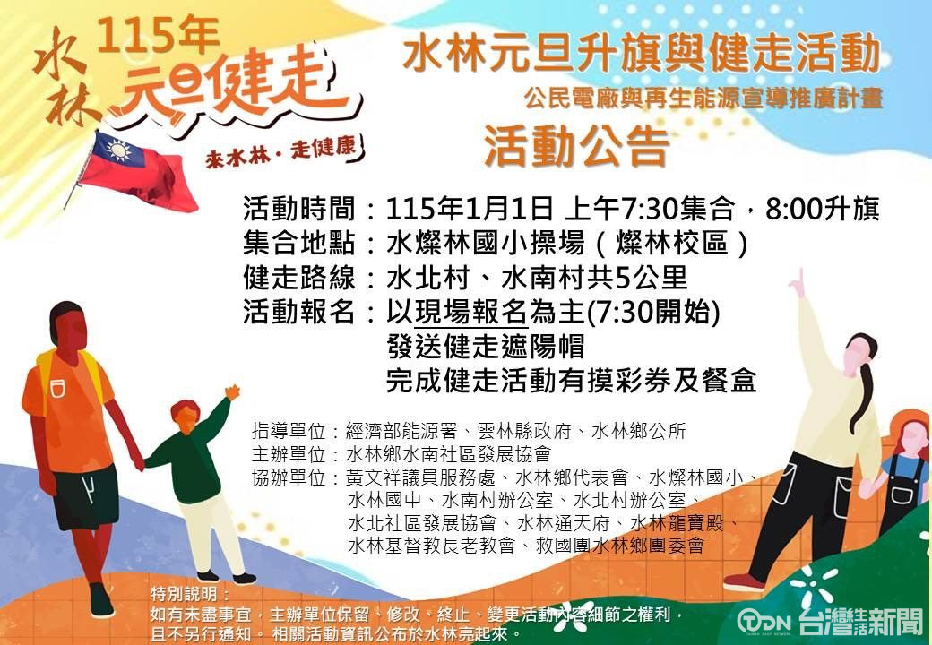 歡喜迎接新年,水林鄉水南社區發展協會今年將再度舉辦元旦健行活動,邀請鄉親一起來到水燦林國小迎接新年,也走出健康活力。協會表示,今年的健行路線全長約5公里,將經過在地信仰中心龍寶殿及通天府、長老教會,沿路不僅有國旗點綴,還有精采的樂器演出,完成健行後更有抽獎活動,歡迎民眾踴躍參與。