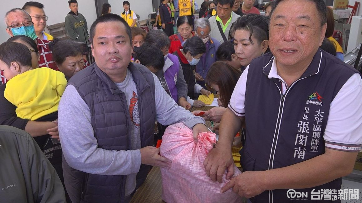 民眾排隊領取關懷物資,希望透過實際行動,關懷需要協助的家戶,落實社會公益服務,準備了棉被、奶粉、米等民生物資以及扶困濟貧用品一份,並發放每戶兩千元的小紅包,希望在歲末之際,能夠讓這些家戶感受到社會的溫情。