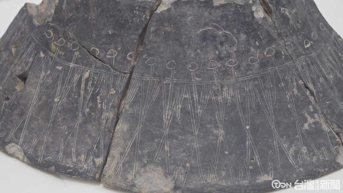 ▲雲林縣湖山水庫遺址館於12/29日開幕,展出多達238件文物,包括陶器、石器等,其中一項為國唯一的「牽手跳舞灰黑砂陶圈足殘件」,陶器呈現喇叭型,間接反映出該文化可能具有群體祭祀或慶典活動。/記者 江儀 攝
