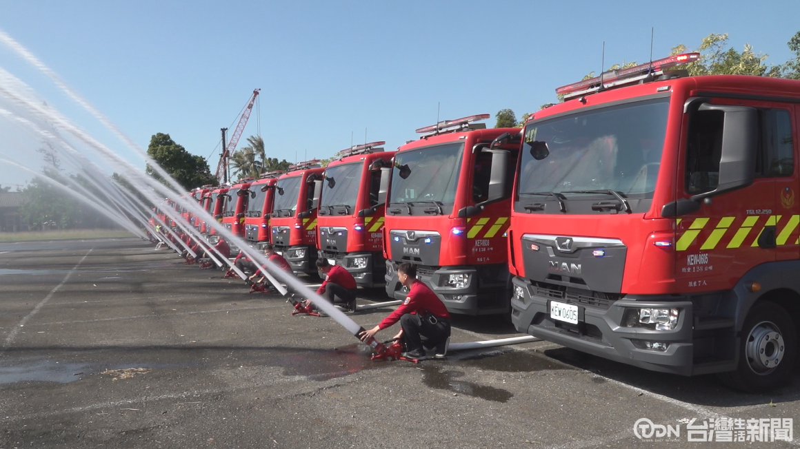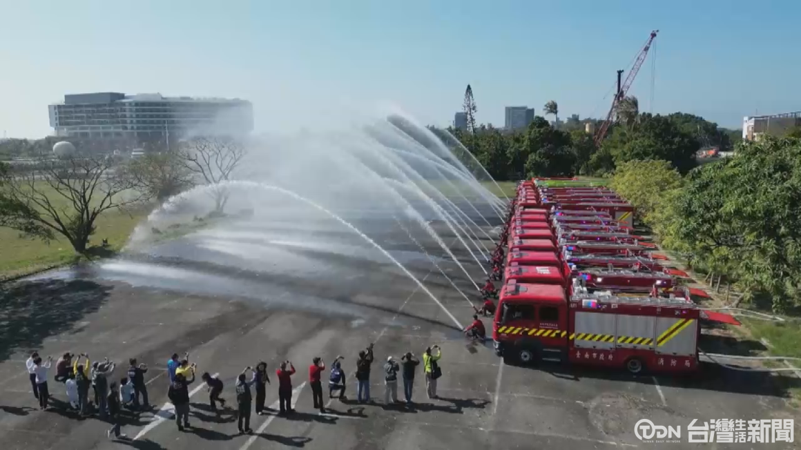 一聲口號,整排16輛新購買消防車一起噴水,這是臺南市政府消防局爭取中央補助,新購買救助器材車1輛、水庫車7輛和水箱車8輛,由副市長葉澤山代表市長到場校閱,未來將分配給16個分隊使用。