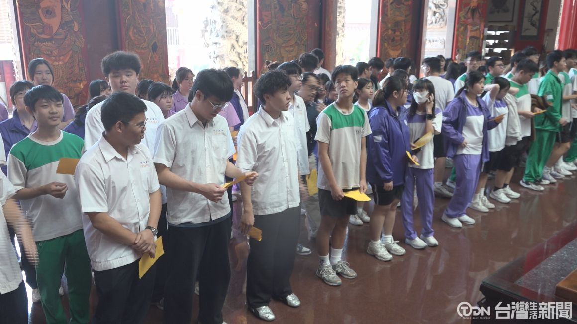 ▲115年大學學測即將到來,竹山高中就帶著高三的學生,前往克明宮,向文昌帝君上香祈福。/記者 周有勝 攝