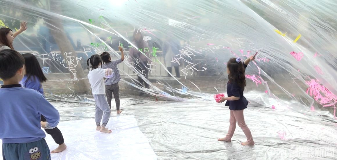 巨大的汽球現身,孩子們跟著老師黃月珍一起將汽球變成小魚缸世界,大家先用奇異筆塗鴉出自己的想像,有各種的魚類、生物出現在各個角落。