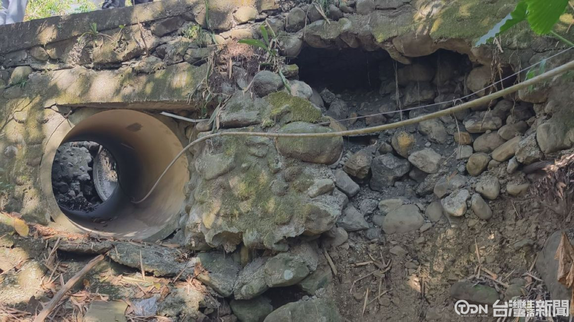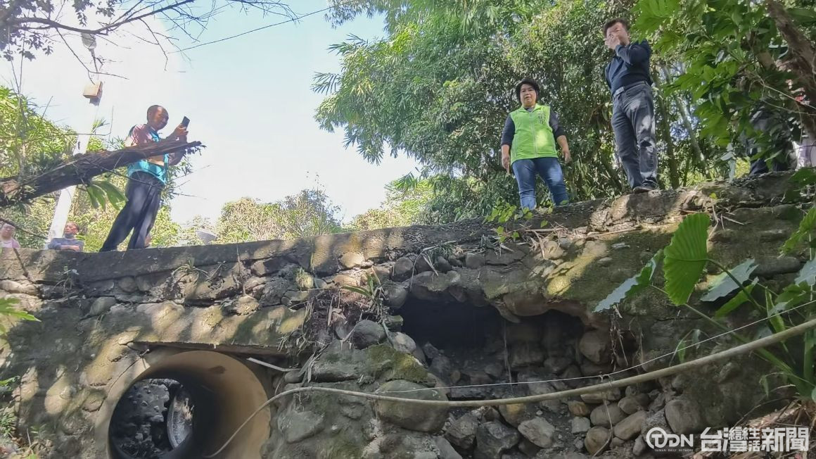 ▲艾米颱風造成路基掏空與排水設施損壞狀況/記者金芸亘攝