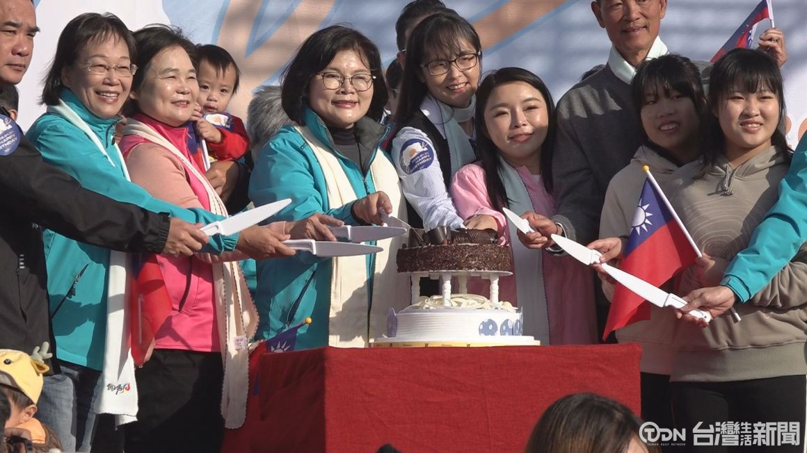 ▲現場也為百位元旦壽星切蛋糕慶生,隨後健行至朝天宮參拜,氣氛相當熱鬧。記者林虹伯/攝