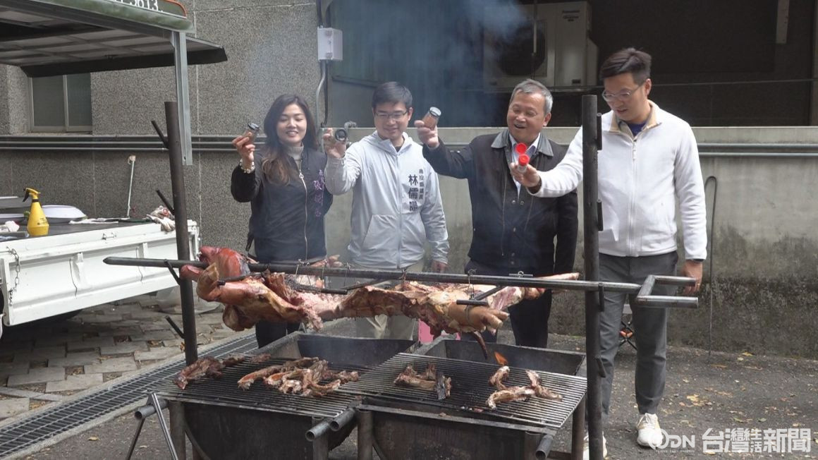 ▲整頭烤豬在架上翻烤,副縣長王瑞德(右二)、南投市長張嘉哲(右一)、議員張婉慈(左一)、議員林儒暘(左二)共同灑下好運粉祝福,為市集增添熱鬧氣氛/記者 蔡育楷 攝