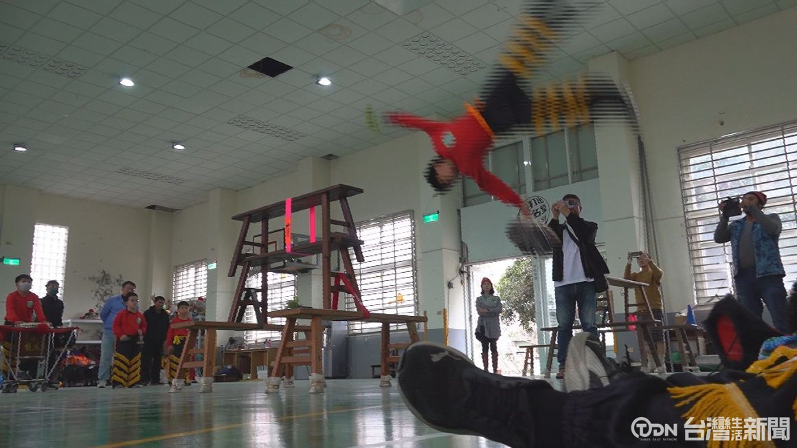 ▲負責指揮獅陣表演的獅鬼翁宏德同學說,一開始要空翻時相當緊張,但經過教練的細心陪伴才完成空翻表演。/記者 陳佳昇 攝。