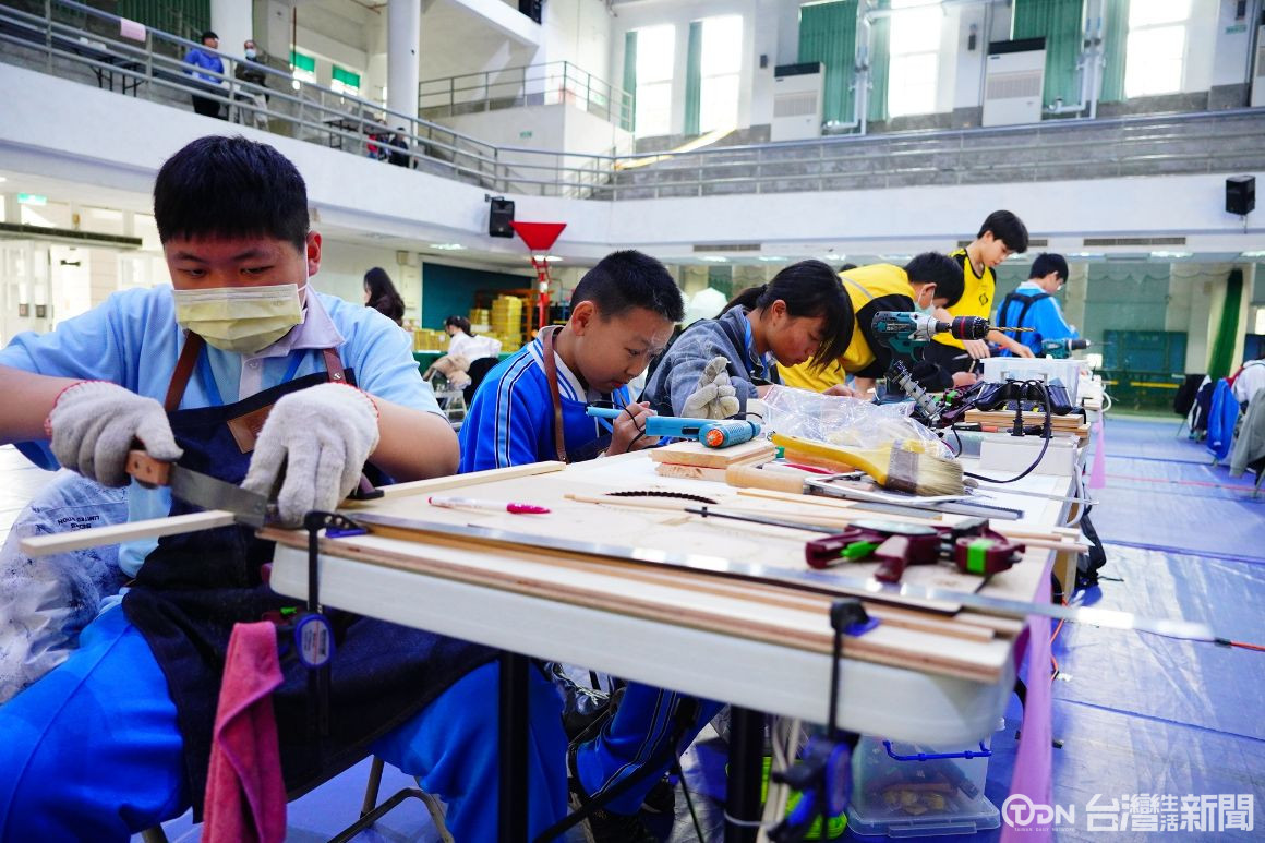 ▲嘉義市政府舉辦科技教育創意實作競賽,學生親自動手搭建橋樑。/記者周書聖 攝
