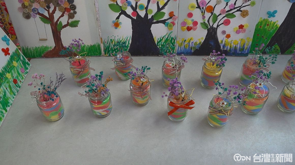 ▲桌上擺滿了長輩參與據點才藝課程DIY的成果作品/記者 賴秋峰攝