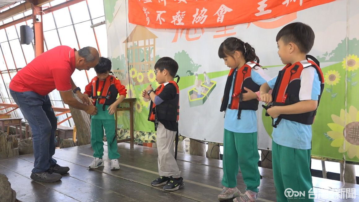 ▲在人員的引導下,孩子們學習如何正確穿上救生衣/記者 陳柏翰攝