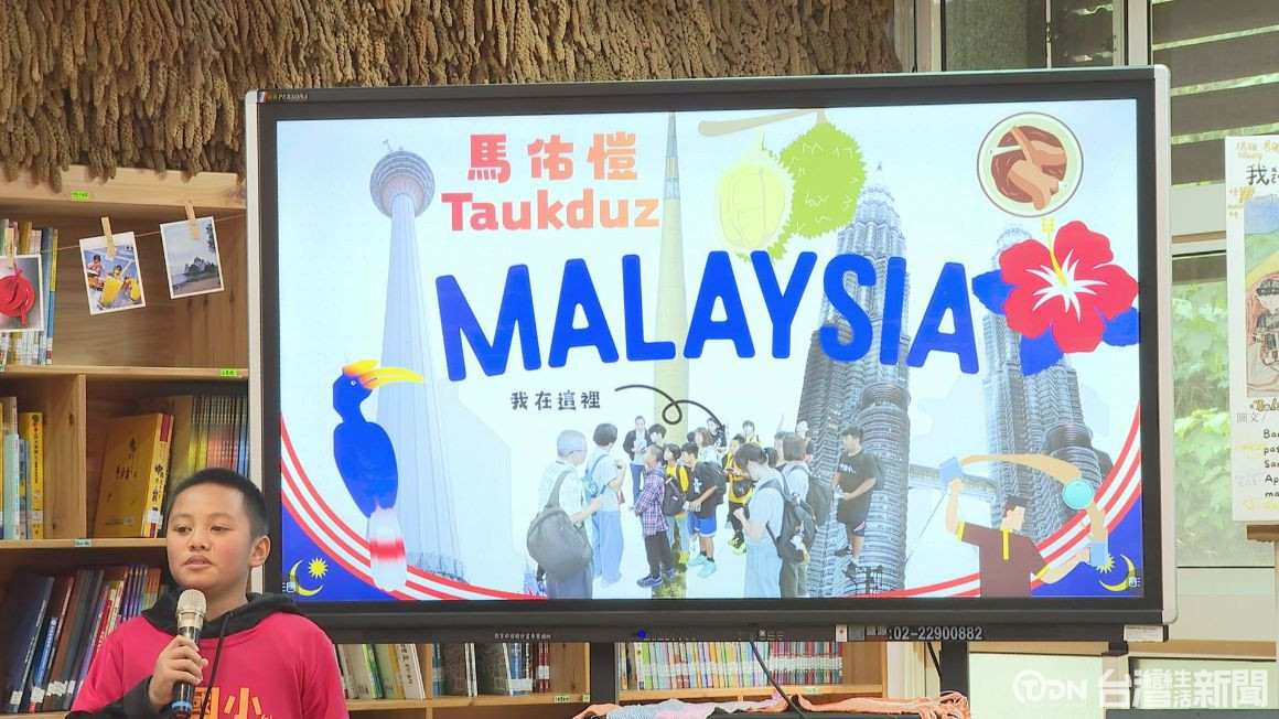 小朋友演唱馬來西亞組曲,這是久美國小日前,前往馬來西亞進行國際教育交流的學習成果之一,以文化探究為核心並將自身融入其中,學習多元文化共榮精神,同時也將學校所創作的「我和我的小米同學」繪本,帶去做文化學習分享。