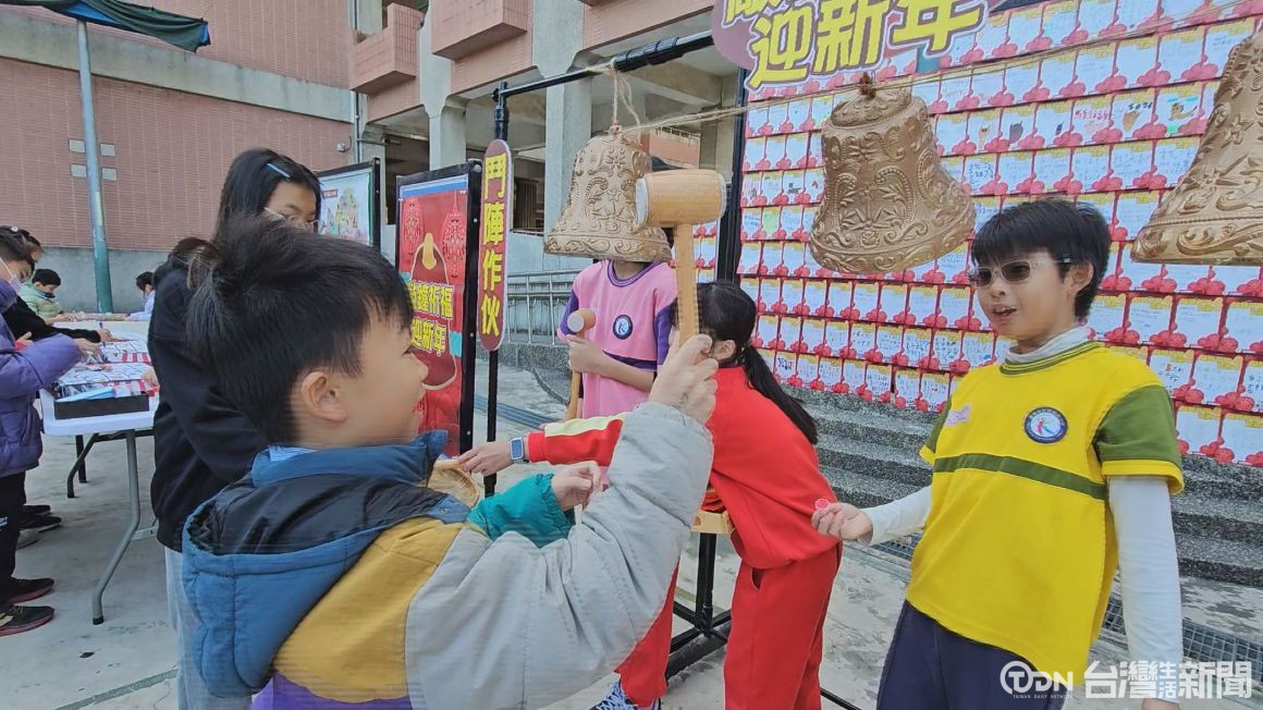 ▲永康國小學生說吉祥話並敲鐘祈福,可獲得學校特別準備的紅包,象徵新年祝福。/記者 蕭建緯攝