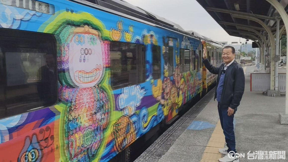 ▲集集鎮長吳大村歡迎遊客搭乘集集小火車彩繪列車來到集集遊玩參觀燈會/記者金芸亘攝
