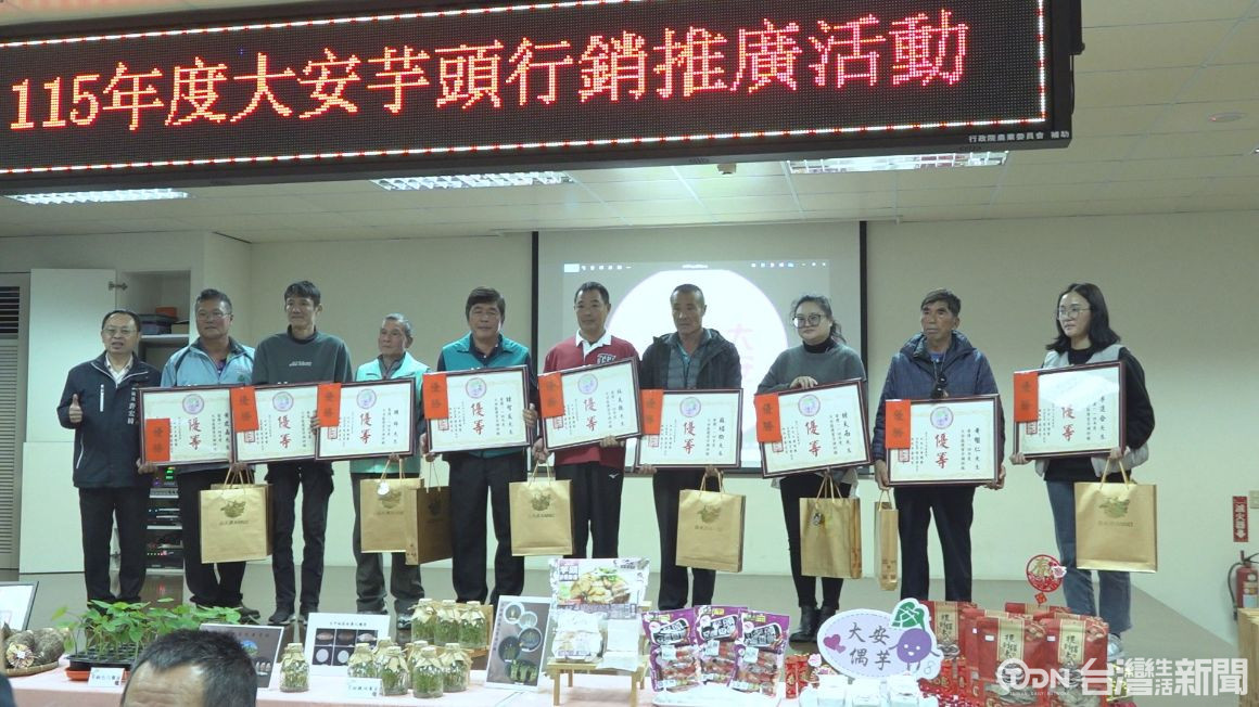 農友們依序上台領獎,臉上滿是笑容,大安區農會這天舉辦芋頭行銷推廣活動,當中也特別表揚在芋頭評鑑中,表現優異的農友,肯定他們長年用心栽培與改良的成果。