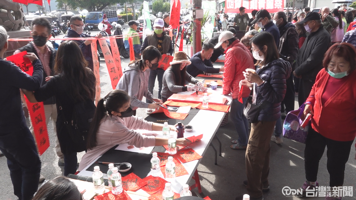 書法老師專心寫著春聯,有很多民眾耐心等候等著索取,這是市議員蔡麗青在新春之際,邀集各界愛心所舉辦的安南尚青公益活動,第1站選擇安南區新順社區出發,希望幫助需要的人。